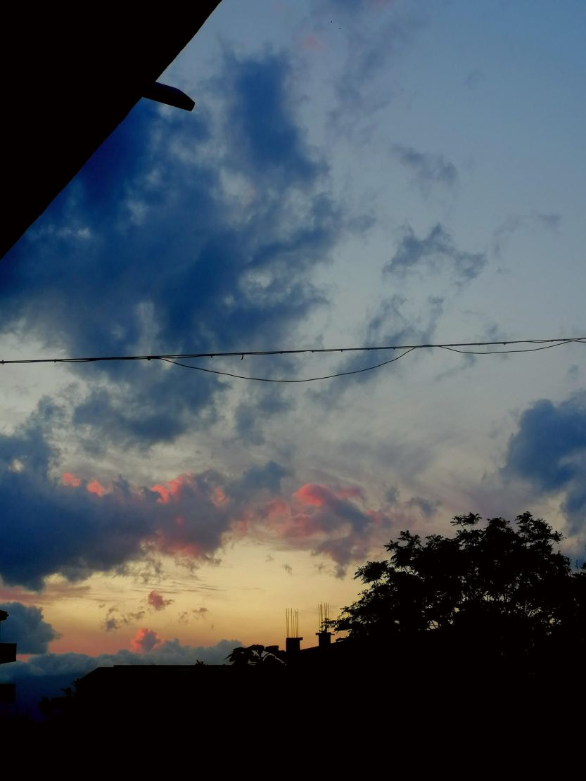 Abbiamo osservato il cielo, che ci riempiva ogni atomo di blu, le nuvole leggere e a volte fitte, che guardandole mutavano e si spostavano, cambiando colore.