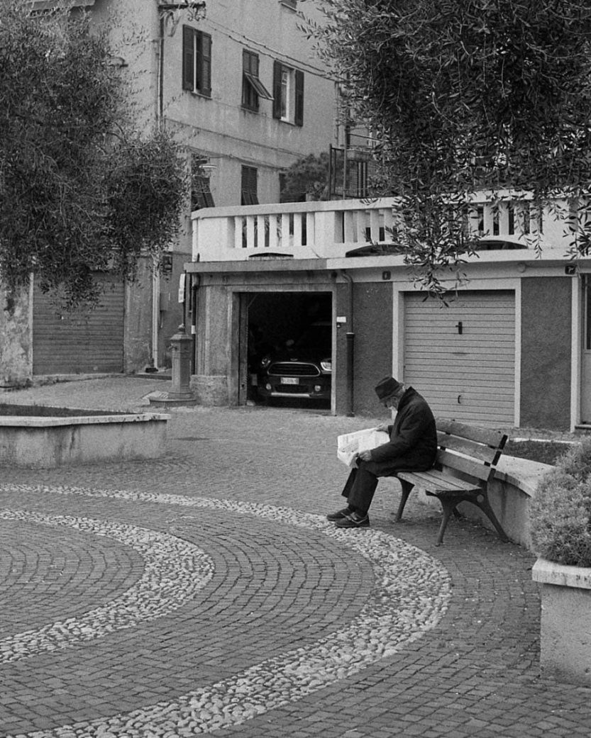Il tempo si ferma, osservo il grande albero ripararlo affettuosamente dal sole del mattino; le sue foglie filtrano la luce in modi fantasiosi, come per intrattenere un vecchio amico. Mi accorgo che quel personaggio è parte di questo posto ormai, gli appartiene quanto le radici del grande albero, quanto il caffè all’angolo con l’insegna un po’ sbiadita e il tabacchino che rimane anche se non c’è più. Fa parte di questi luoghi e sarà sempre parte di questo mio fotogramma mentale, che sembra non aderire più alla realtà, ma trovarsi in un tempo sospeso, quello delle mie storie, quello dove iniziano i vicoli e le strade dei miei romanzi.